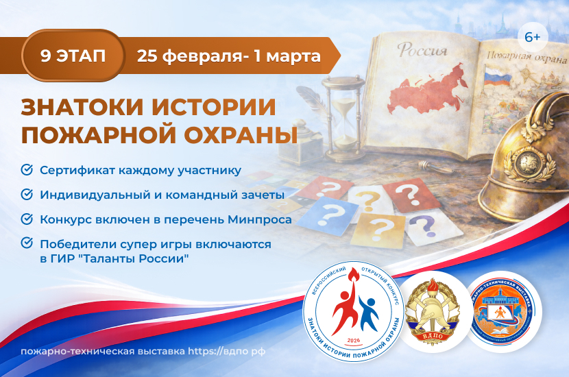 Принять участие в онлайн-квесте «Знатоки истории пожарной охраны. Отборочный этап №9» (сезон 2025/2026) может любой желающий в индивидуальном формате в любое время с 12:00 (мск) 25 февраля 2026 по 16:00 (мск) 1 марта 2026.